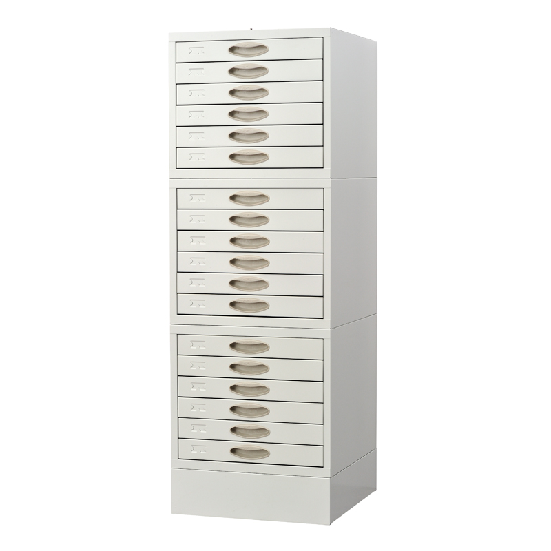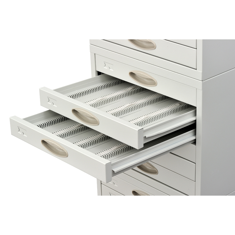 底座采用宝钢SPCC1.2冷轧钢板,箱体0.8冷轧钢板,抽屉0.8冷轧钢板,每组3节,加底座一只,每节六个大抽,抽内配有数字标签便于存档,每组可存晾片9000张。