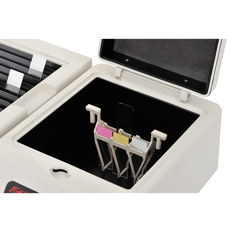 流动循环热风烘片设计,精巧密封的烘片舱体可摆放多种玻片染架,支持组织切片更快速烘干并贴合载玻片